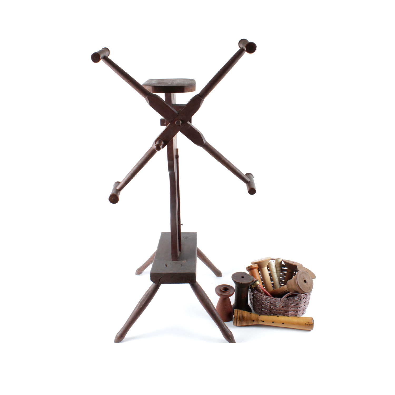 Antique Yarn Winder And Collection Of Wooden Spools Ebth