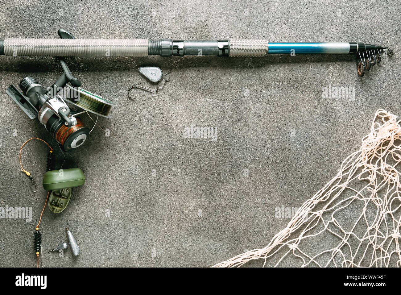 Fishing Tackle Net And Accessories On Grey Background Stock Photo