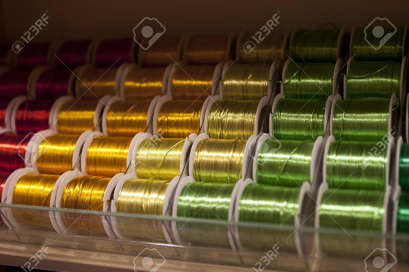 Colored Spools Of Wire Placed In The Shade On A Shelf In The