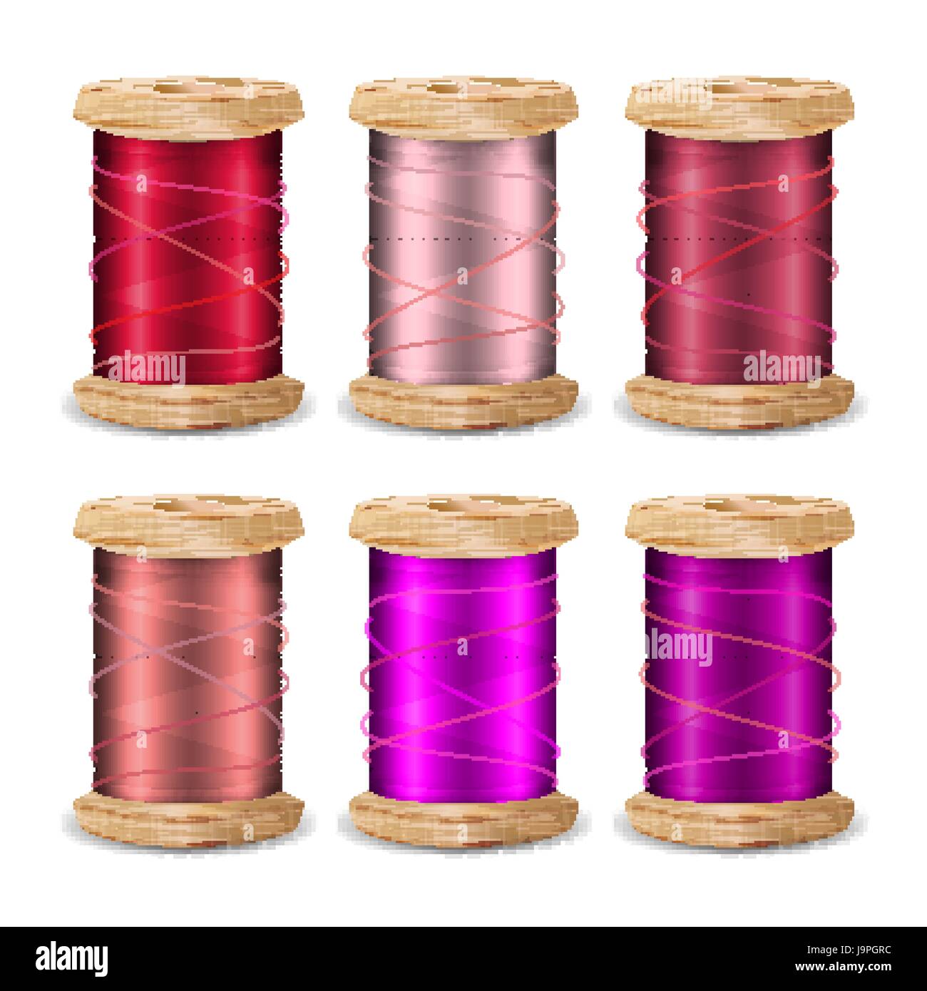 Thread Spool Set Bright Old Wooden Bobbin Isolated On White