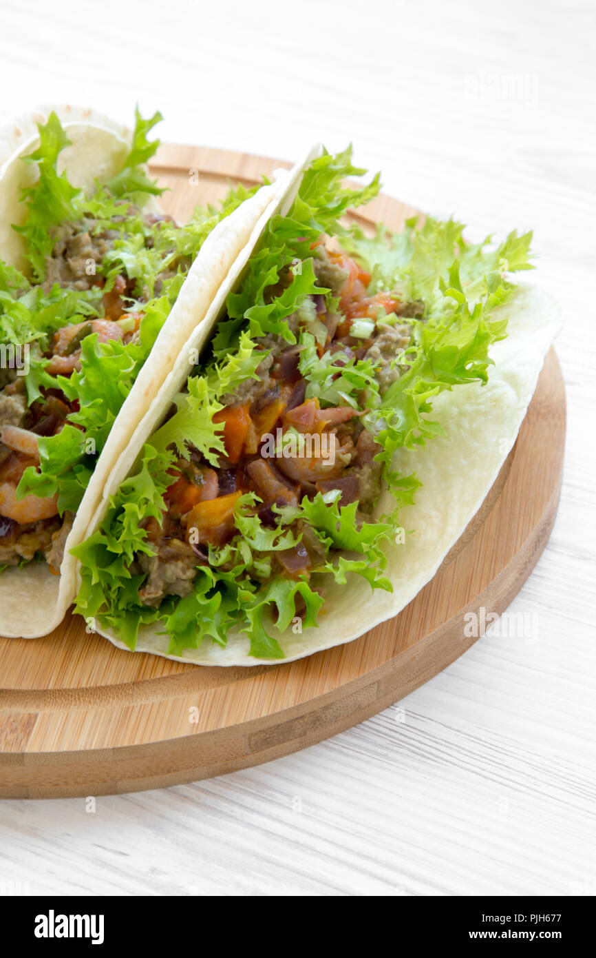 Shrimp Tacos On Round Bamboo Board On White Wooden Table Side
