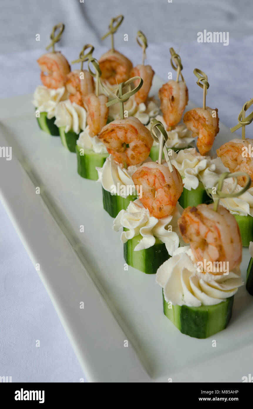 Spicy Shrimp Con Pepino Y Queso Crema Pinchos Servidos En La Placa
