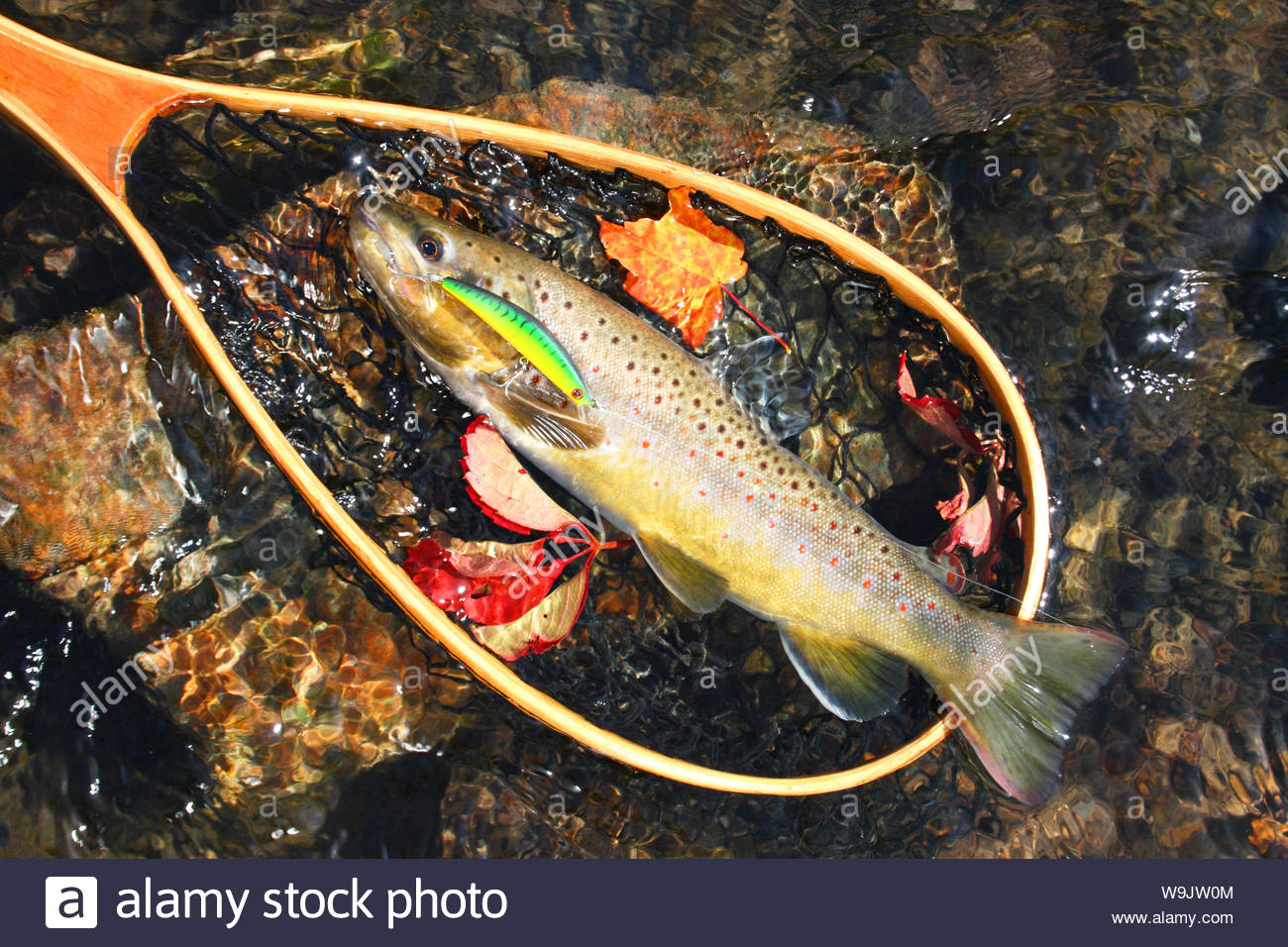 Brown Trout In Net Captured In Stream With Minnow Lure Fall