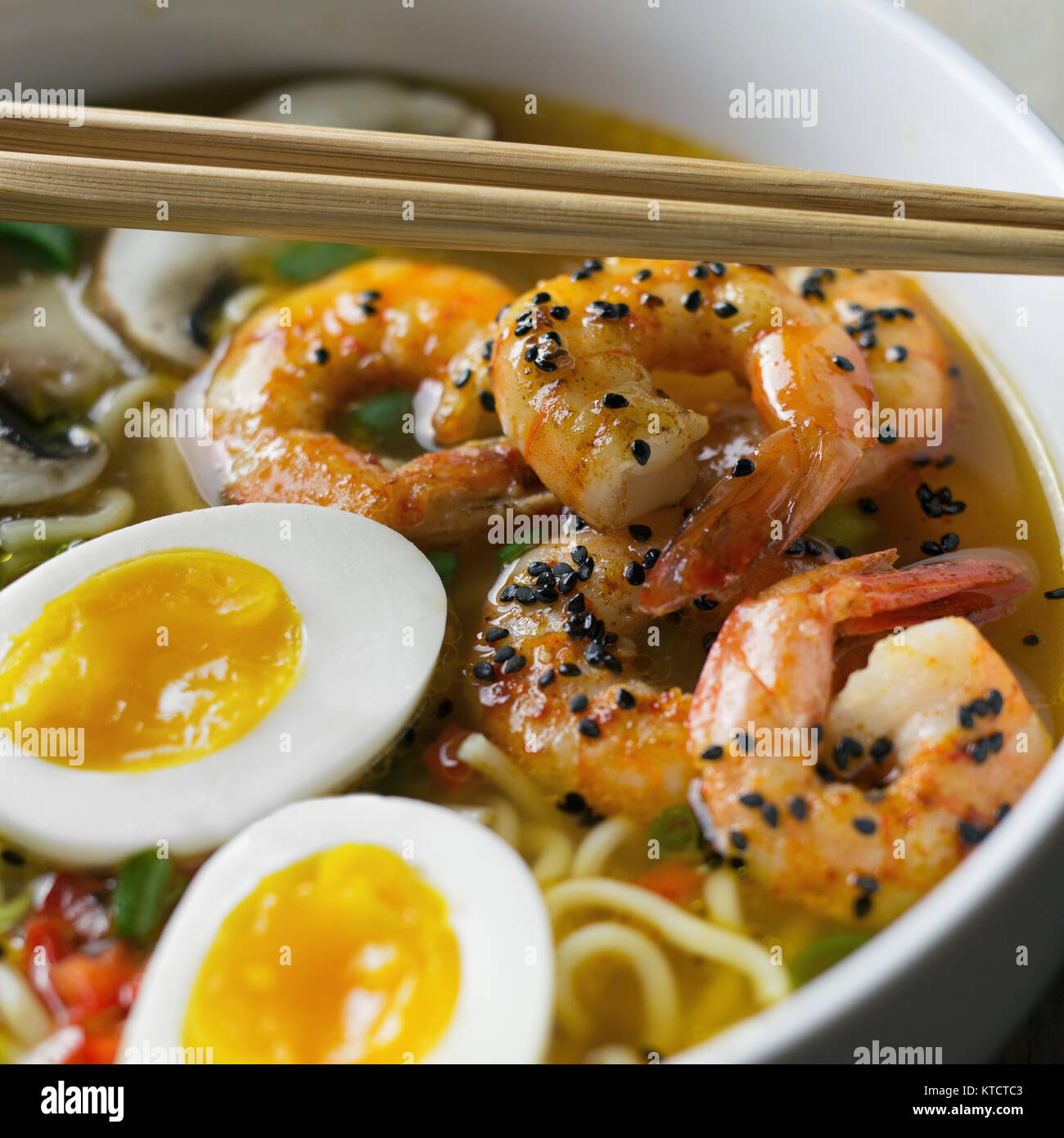 A Bowl Of Ramen With Egg Shrimp Mushrooms And Snow Peas White