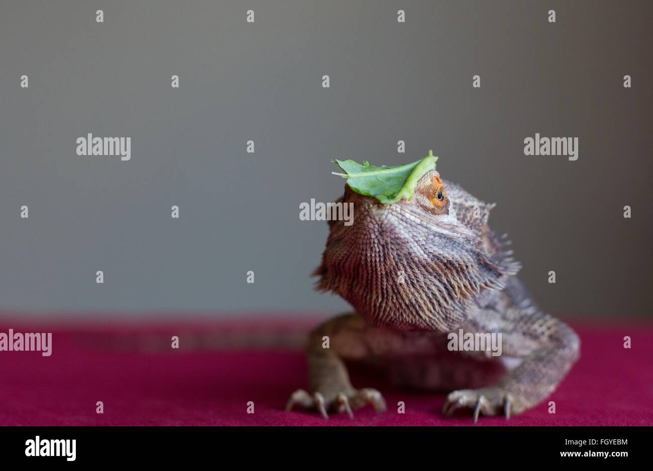 A Cute Bearded Dragon Lizard With A Piece Of Lettuce On His Head