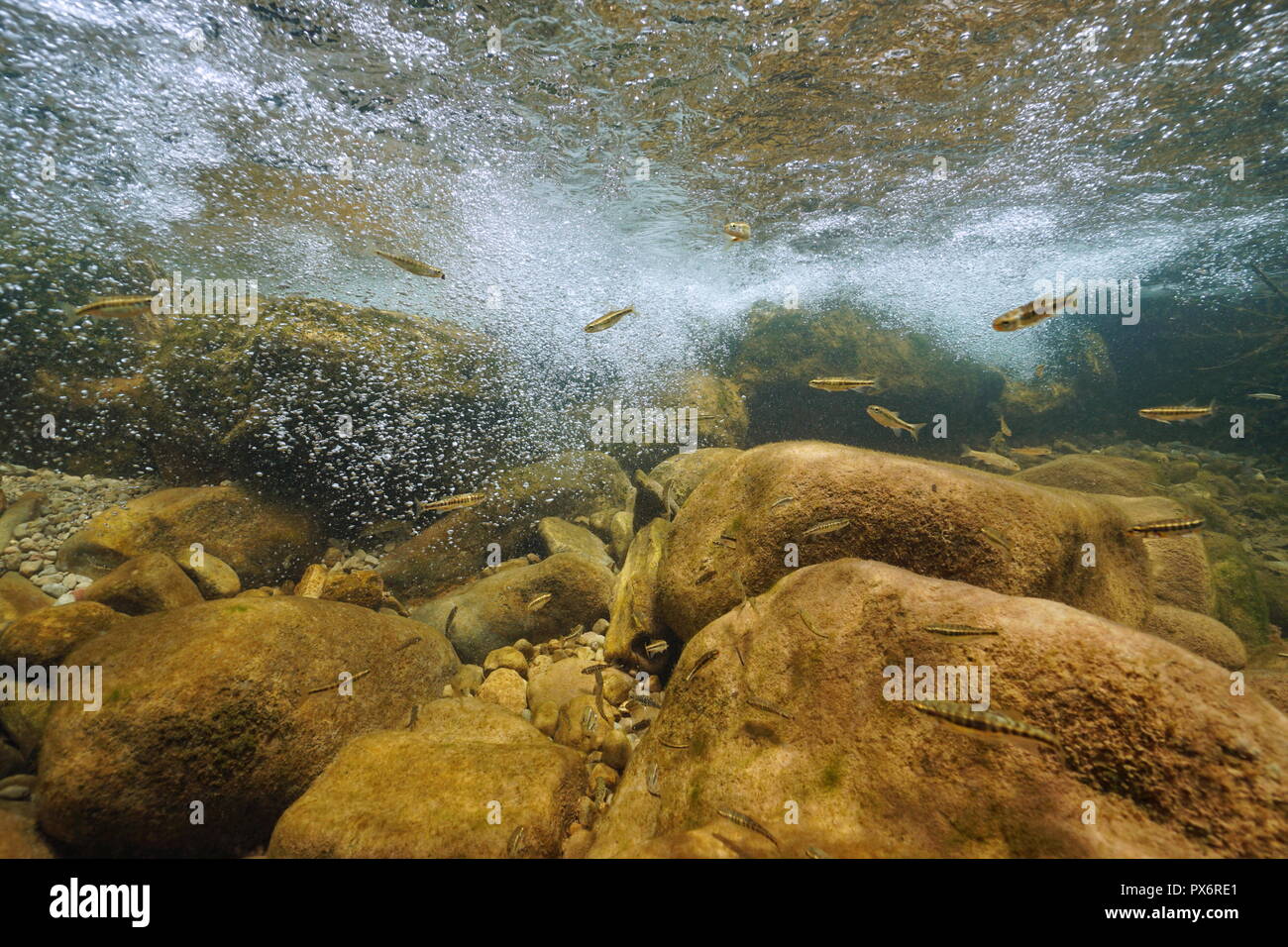 A Rocky River Underwater With Air Bubbles And Minnow Freshwater