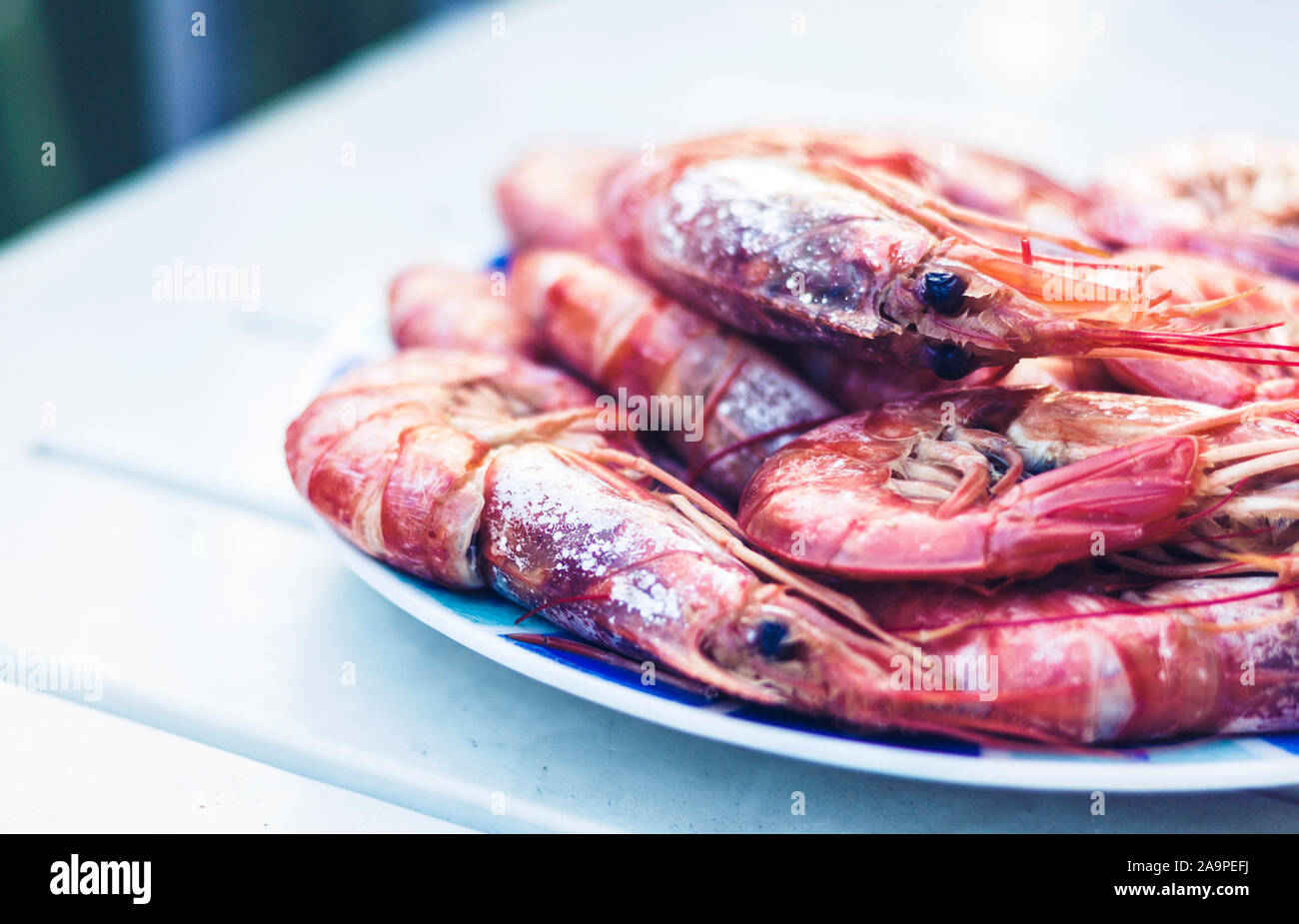 Boiled Red Shrimps Prawns On The Plate Seafood From The Fish