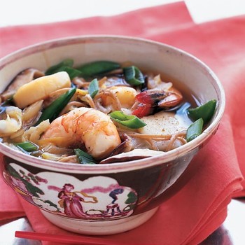 Asian Broth With Poached Shrimp Scallops And Soba Noodles